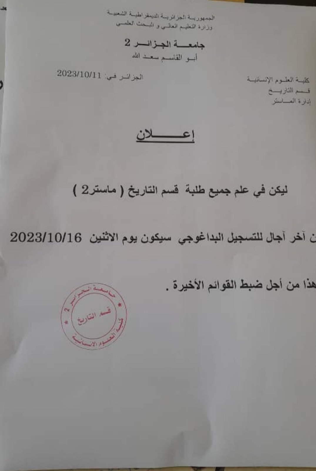 السنة الدراسية 2023/2024 التسجيل البيداغوجي للسنة أولى ماستر